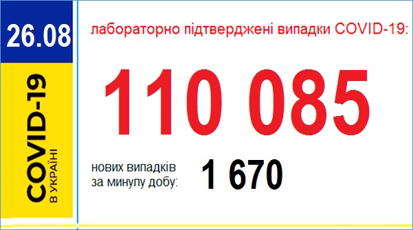 26 серпня (станом на 9:00) в Україні лабораторно підтверджено 110 085 випадків інфікування COVID-19, з них: 2354 летальні, 53 454 пацієнти одужали.