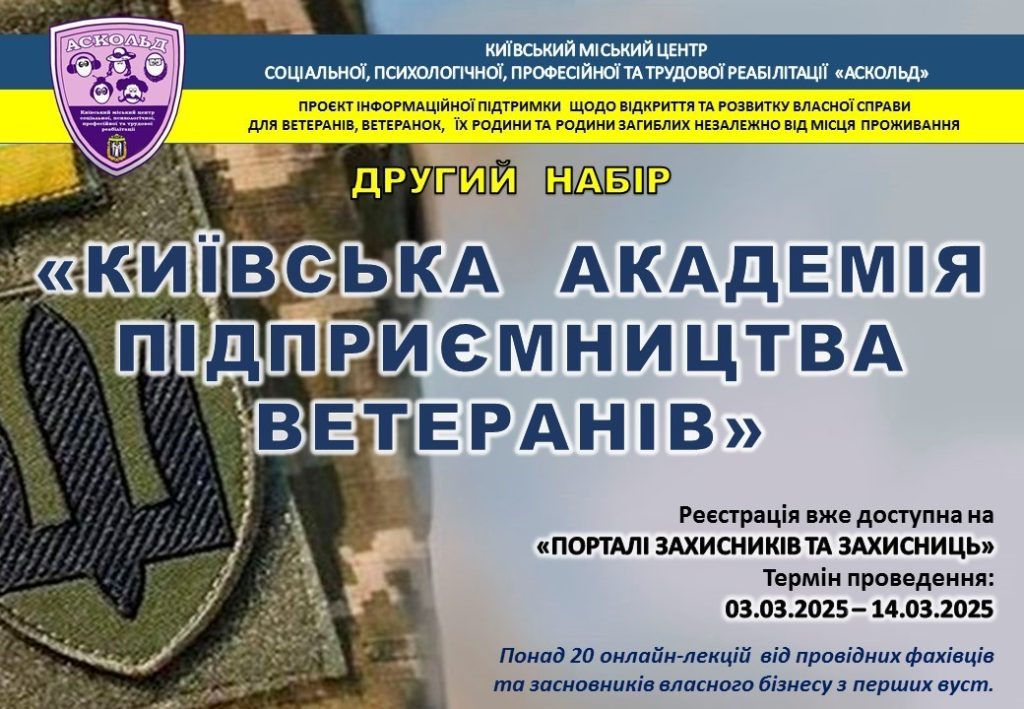 Розпочато другий набір до «Київської академії підприємництва ветеранів» – проєкту інформаційної підтримки щодо відкриття та розвитку власної справи, організованого Київським міським центром соціальної, психологічної, професійної та трудової реабілітації «Аскольд».