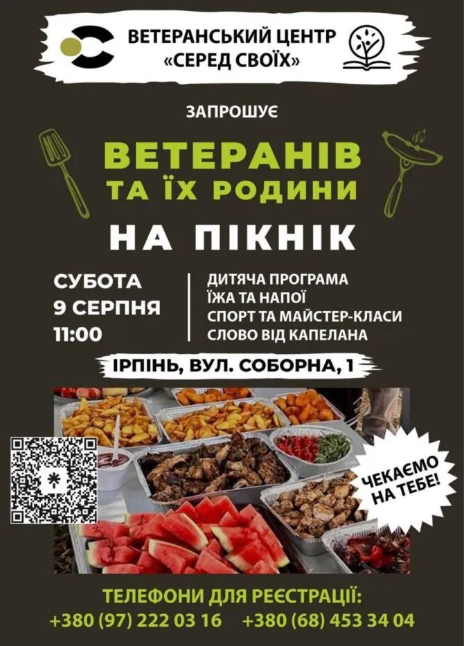 Ветеранський центр «Серед своїх» запрошує ветеранів з Ірпеня та їх родини на пікнік. У програмі: смачний обід, дитяча програма, відпочинок на природі, спорт та майстер-класи, слово від капелана.