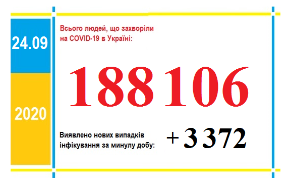 А на дев’яту годину ранку 24 вересня2020 року в Україні зафіксовано вже 188 106 хворих на COVID-19. За останню добу виявили 3 372 інфікованих, що трохи менше, ніж добою раніше.