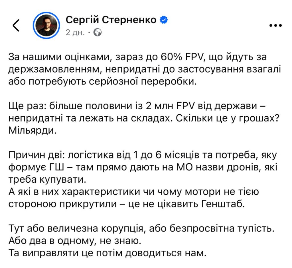 Стерненко називає дві причини: логістика від одного до шести місяців та потреба, яку формує Генштаб — там прямо дають на Міноборони назви дронів, які треба купувати.
