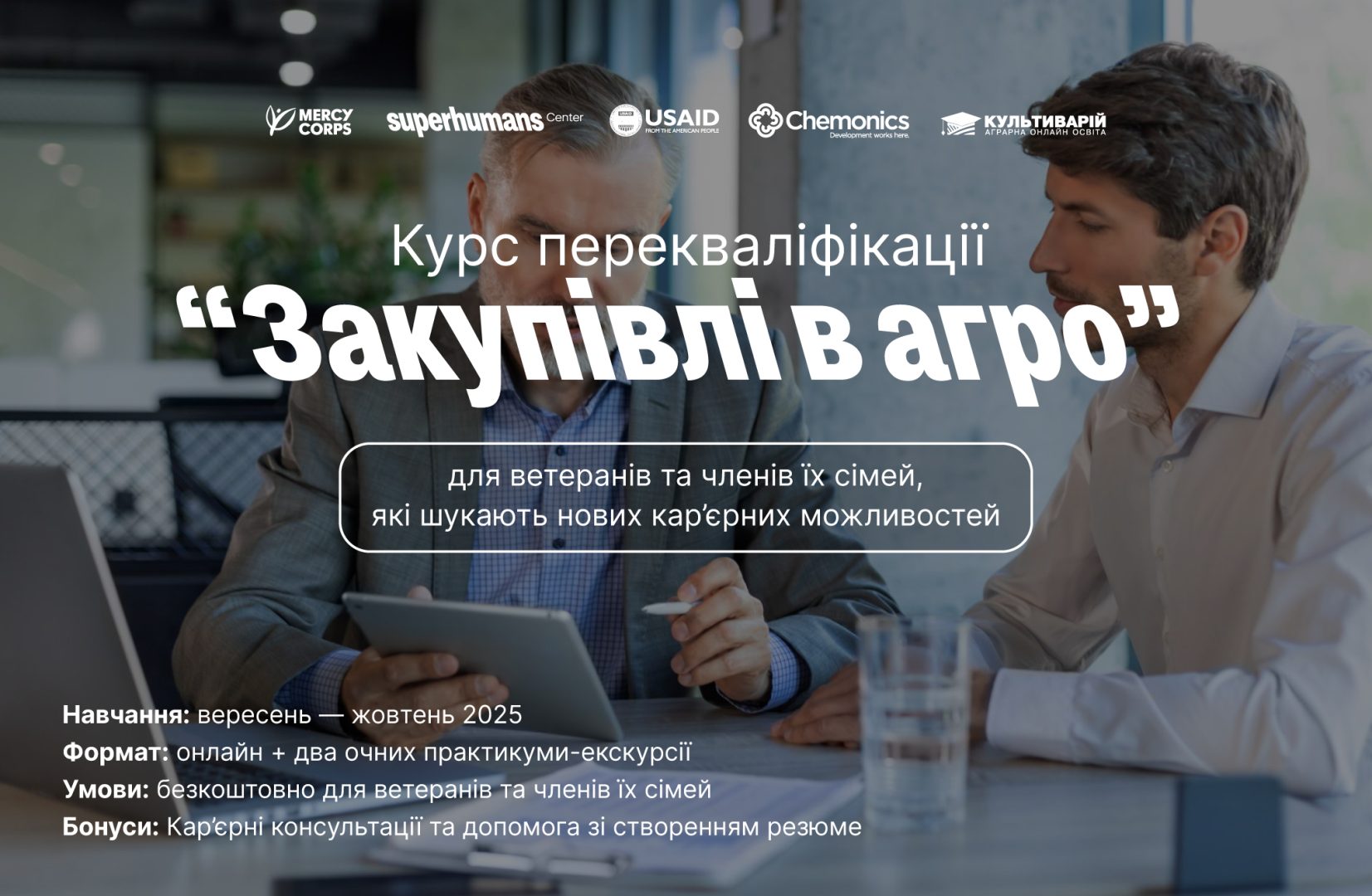 До 15 вересня 2025 року ветерани та члени їхніх сімей можуть зареєструватися на другу хвилю навчальної програми професійної перекваліфікації «Закупівлі в агро». Курс дає можливість опанувати навички роботи у сфері закупівель і продажів агросектору та створює базу для майбутнього працевлаштування. Подробиці — у нашому матеріалі.