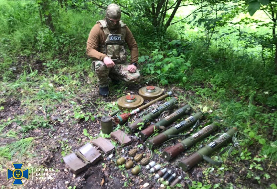 Правоохоронці вилучили зі схованки 5 гранатометних пострілів РПГ-22, 4 протипіхотні осколкові міни МОН-50, 2 протитанкові міни ТМ-62, 6 ручних гранат різних модифікацій, 6 гранатометних пострілів ВОГ, один окопний заряд та одну протипіхотну осколкову міну ОЗМ-72 («міна-жаба»), яка заборонена Оттавською конвенцією 1997 року.