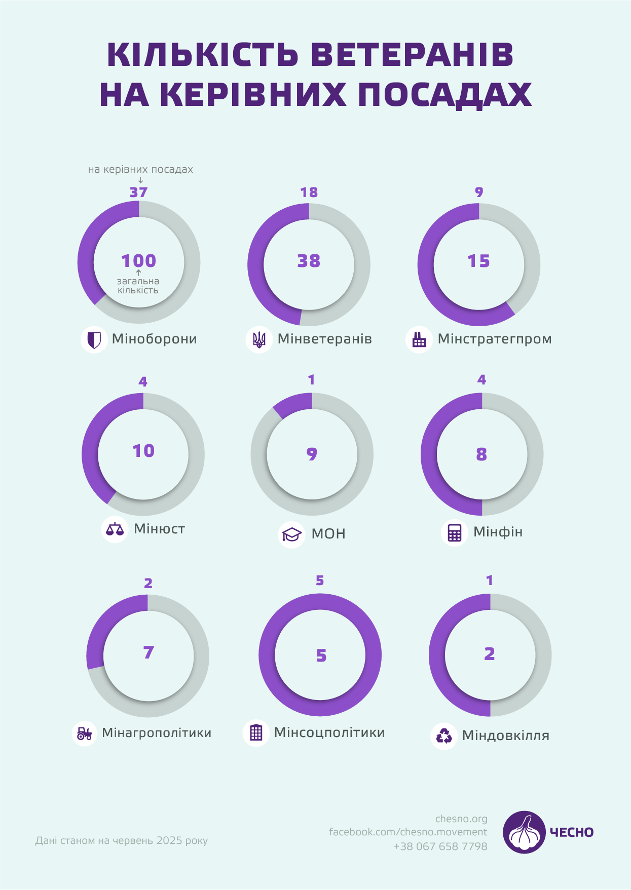 Щоб дослідити участь ветеранів у формуванні політики, Рух «ЧЕСНО» надіслав запити щодо кількості працевлаштованих ветеранів у всіх 19 міністерствах України, зокрема і ветеранів на керівних посадах. Інформацію вдалося отримати від 13 міністерств.