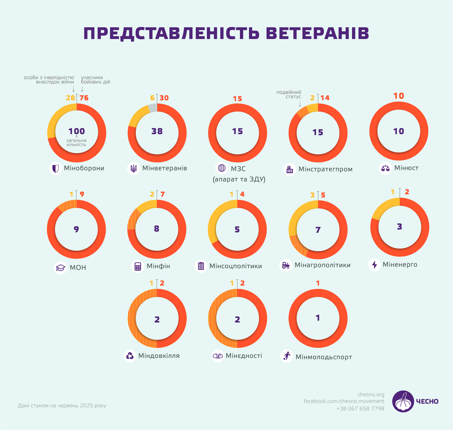 Штат Міністерства соціальної політики вартий окремої уваги — тут усі 5 ветеранів мають керівні посади, зокрема один із них є радником міністра. А в Міністерстві з питань стратегічних галузей промисловості 9 з 15 ветеранів, на штат із 175 працівників, обіймають керівні посади. Однак у міністерствах енергетики, національної єдності, а також молоді та спорту ветерани не обіймають керівних посад.