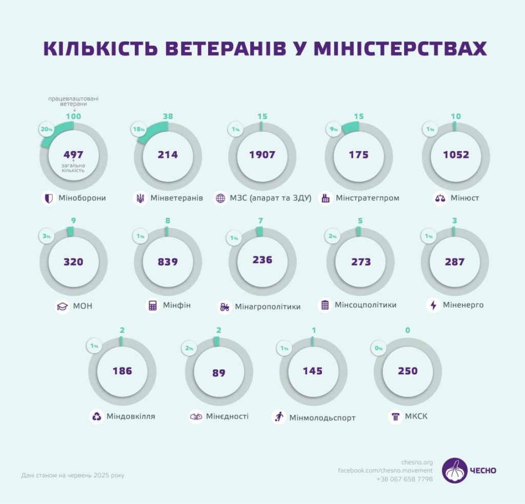За наданими від 13 міністерств даними, найбільша кількість учасників війни, учасників бойових дій та осіб з інвалідністю внаслідок війни працює в Міністерстві оборони України — 100 з 497 співробітників, причому 37 із них на керівних посадах. Також у Мінветеранів наразі працює 38 ветеранів, зокрема 18 на керівних посадах, враховуючи, що штат налічує загалом 214 осіб. Зазначимо, що за останній рік кількість ветеранів у міністерстві збільшилася, адже станом на серпень 2024 року їх було 17%, тобто приблизно 30 осіб.
