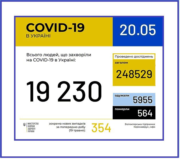 Станом на 09 годину ранку 20 травня в Україні зафіксовано лабораторно підтверджених випадків COVID-19 – 19230, з них: летальні – 564; 5955 пацієнтів одужало.